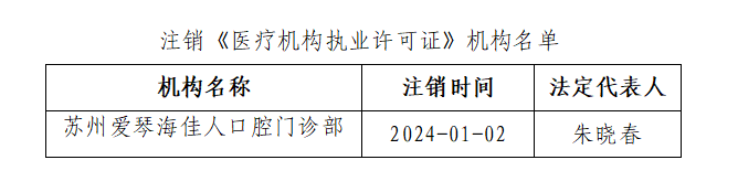 根據(jù)《醫(yī)療機(jī)構(gòu)管理?xiàng)l例》及《醫(yī)療機(jī)構(gòu)管理?xiàng)l例實(shí)施細(xì)則》等規(guī)定,我委受理并審核了蘇州愛(ài)琴海佳人口腔門(mén)診部注銷(xiāo)《醫(yī)療機(jī)構(gòu)執(zhí)業(yè)許可證》的申請(qǐng),并對(duì)其《醫(yī)療機(jī)構(gòu)執(zhí)業(yè)許可證》予以注銷(xiāo),并已予公示,特此告知。
