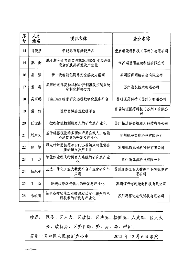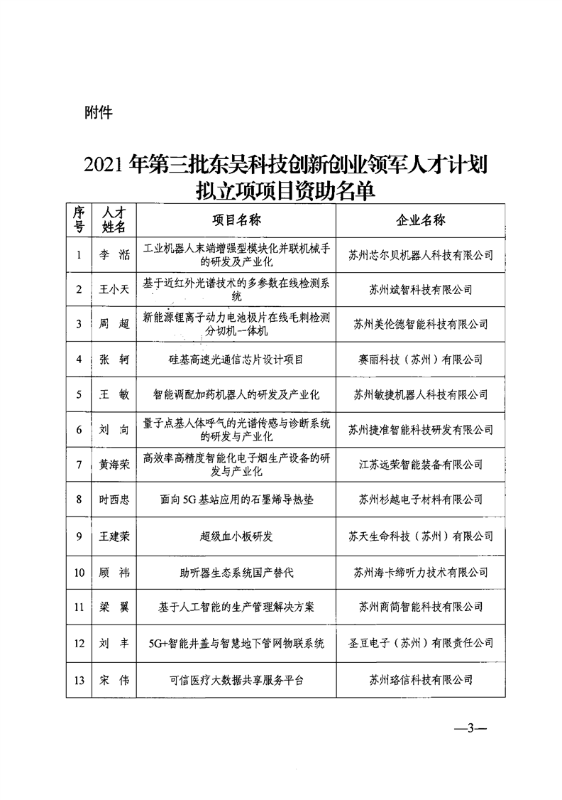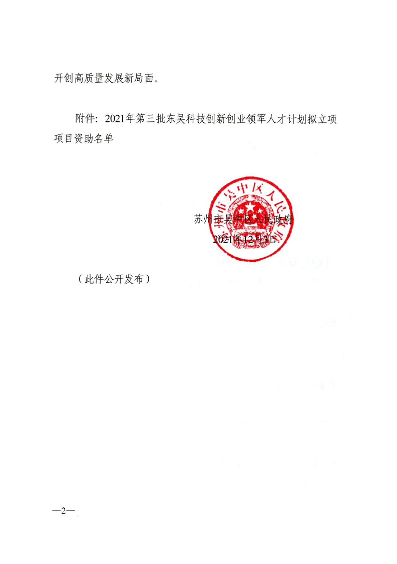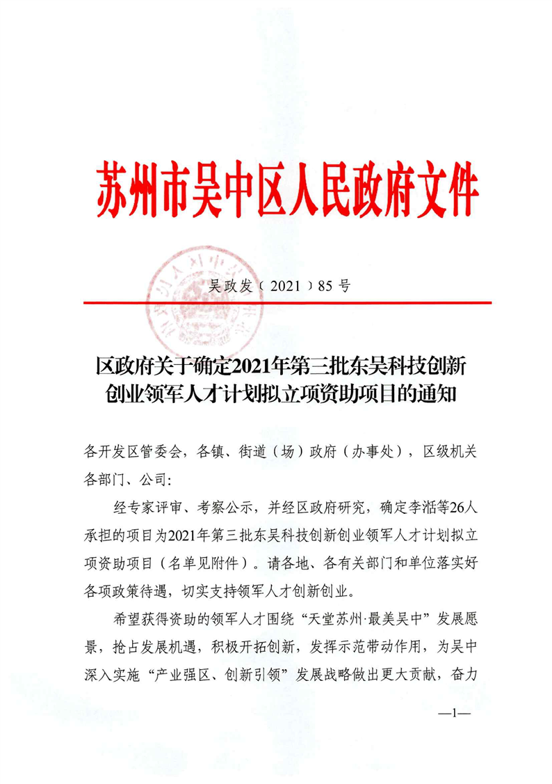 區政府關于確定2021年第三批東吳科技創新創業領軍人才計劃擬立項資助項目的通知