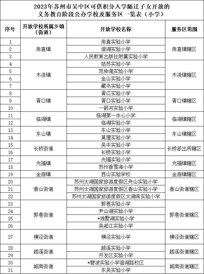 2023年蘇州市吳中區(qū)可供積分入學隨遷子女開放的義務教育階段公辦學校及服務區(qū)一覽表(小學)
