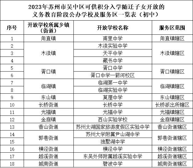 2023年蘇州市吳中區(qū)可供積分入學隨遷子女開放的義務教育階段公辦學校及服務區(qū)一覽表(初中)