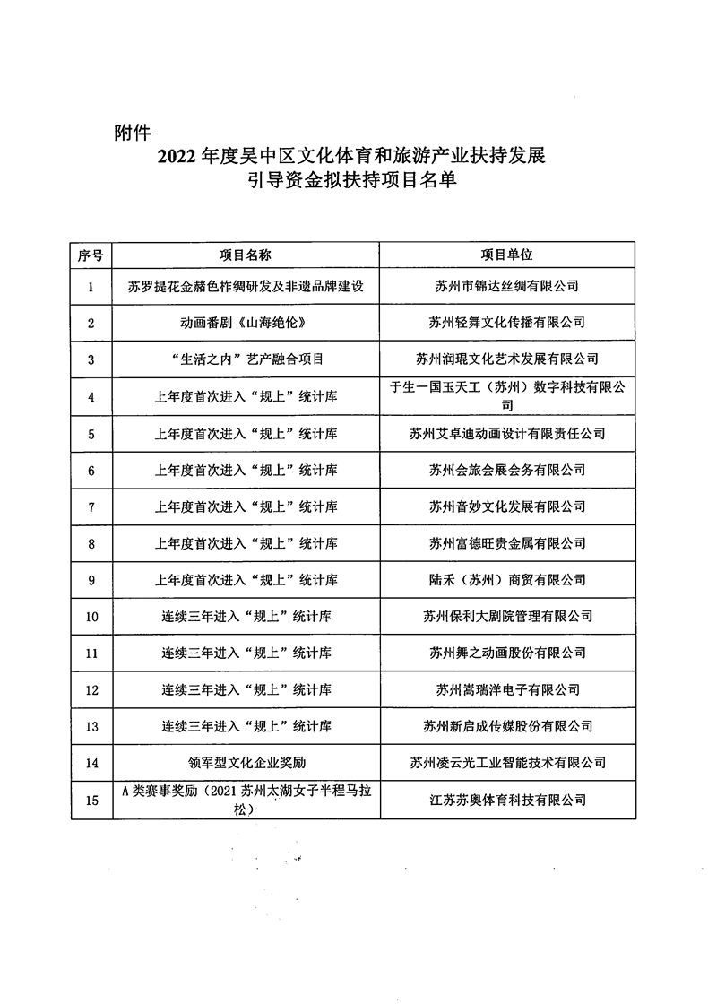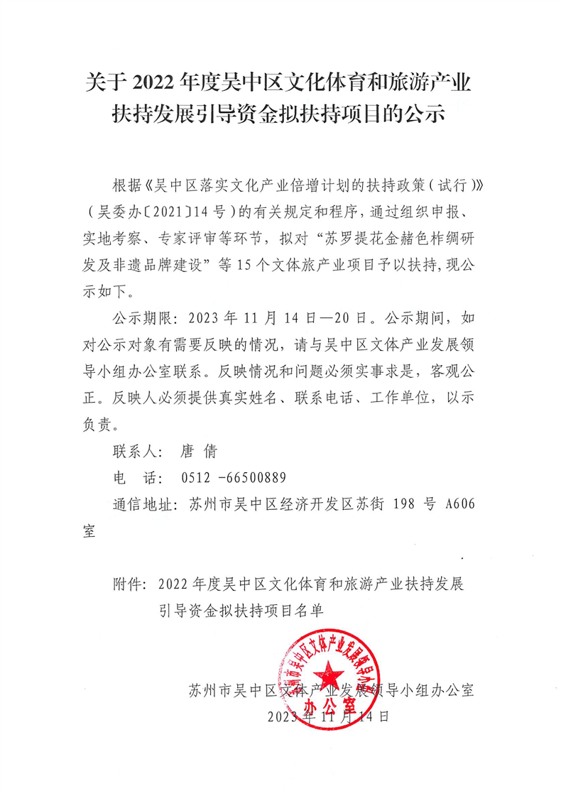 關于2022年度吳中區文化體育和旅游產業扶持發展引導資金擬扶持項目的公示