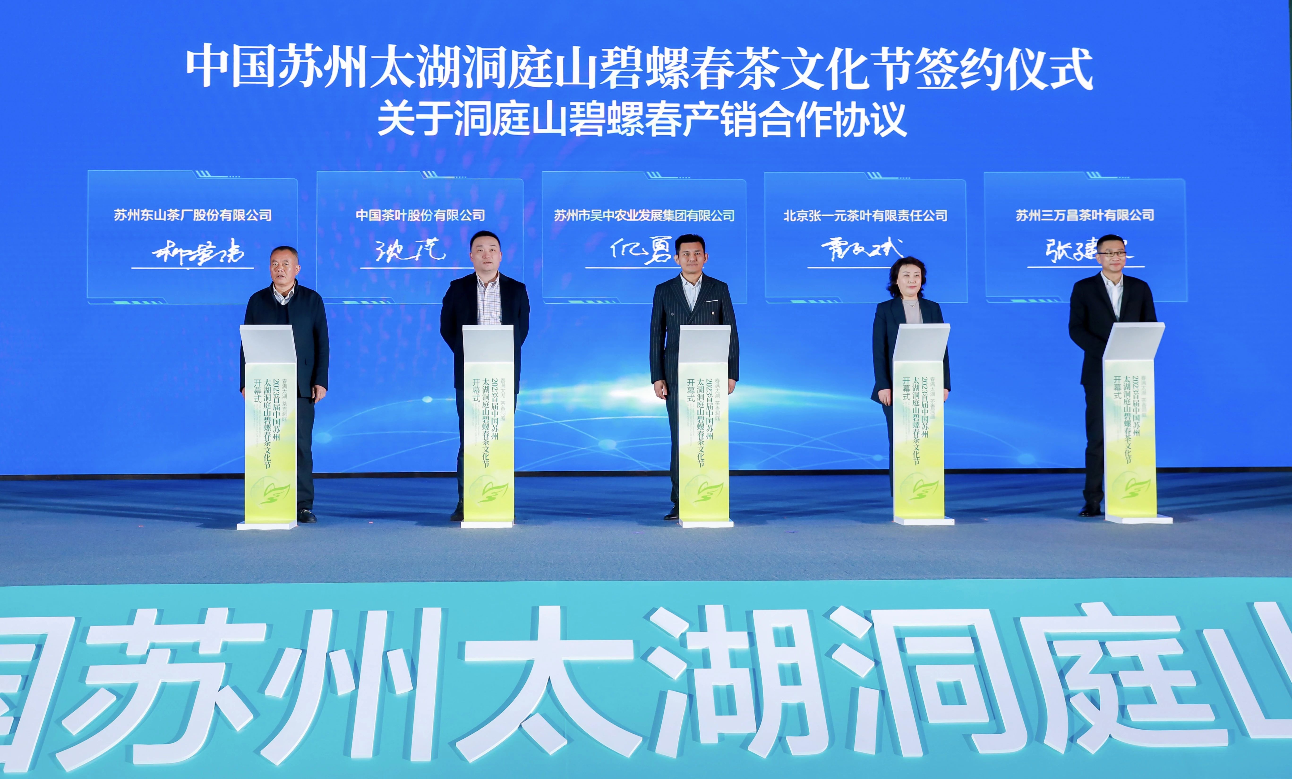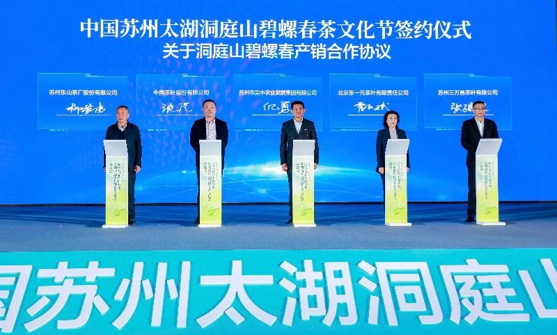 吳中農(nóng)發(fā)集團(tuán)、中國(guó)茶葉股份有限公司、蘇州東山茶廠股份有限公司、北京張一元茶葉有限責(zé)任公司、蘇州三萬(wàn)昌茶葉有限公司簽訂產(chǎn)銷合作協(xié)議。