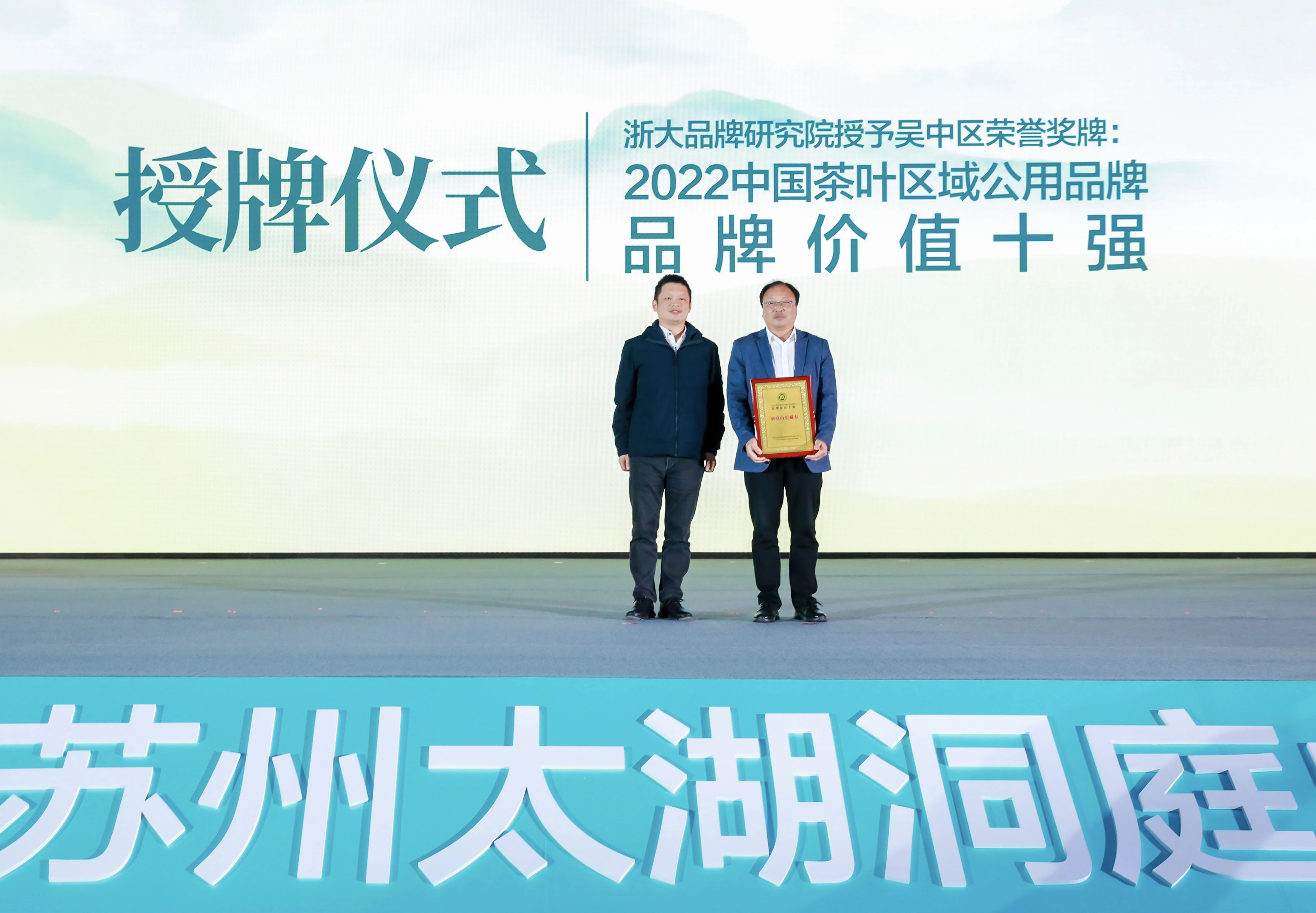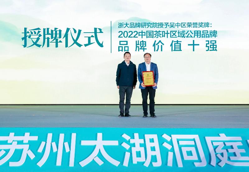授予洞庭山碧螺春茶“2022中國(guó)茶葉區(qū)域公共品牌價(jià)值十強(qiáng)”榮譽(yù)獎(jiǎng)牌。